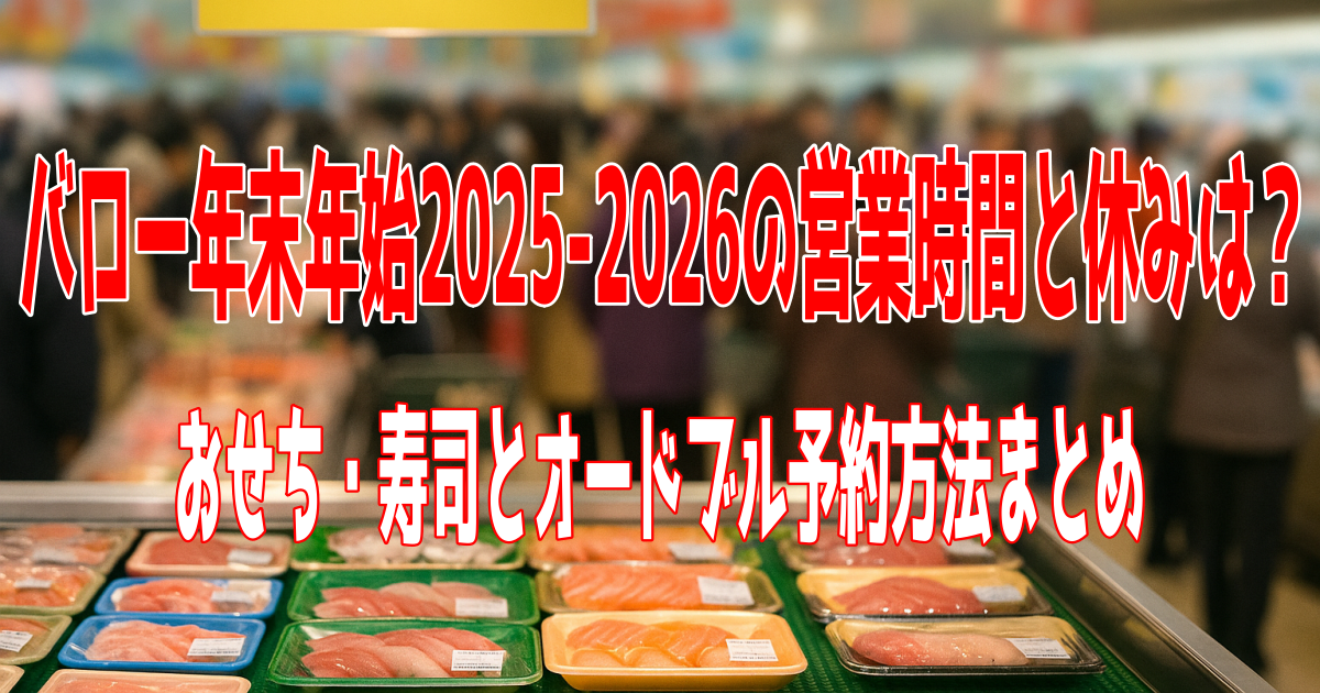 この記事では、バロー公式サイトのお知らせページやチラシ情報、ネットスーパー・予約サイトの特集ページ、それから一部店舗が入っているショッピングセンターのショップニュースなどを確認しながら、年末年始の営業時間とオードブル・寿司の受付状況の傾向を整理しました。